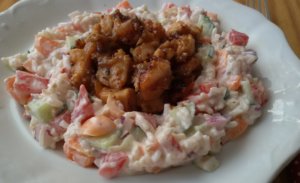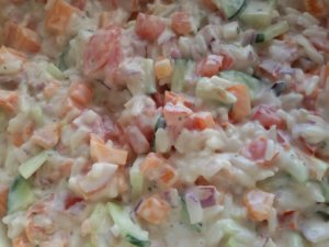 - Összekeverem a tejfölhelyettesítőmet (esetemben Cocomas kókuszkrém) a majonézzel és a mustárral, meghintem egy kis borssal. Ezzel kész a tartáralapunk. Beleöntjük az apróra vágott zöldségeket és a rizst. A zöldségek mennyisége sem szentírás, hiszen ez a méretek függvényében változhat. Ha túl sok a mártás, akkor tehetünk bele több zöldséget utólag is.