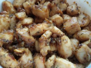 - A csirkét vékony szeletekre vágom, vagy dönthetek úgy is, hogy felkockázom. Mindkét változatban próbáltam, ezúttal a csinos kis kockákat választottam, és nekem ez jobban be is vált e mézes-mustáros pác esetében. Besózom, összekeverem zúzott fokhagymával.