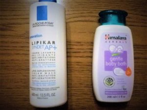 - „Mindenmentes” tusfürdőt használok. Amikor a legdurvább ekcémás korszakomban voltam, akkor lecseréltem a mezei tusfürdőm a bőrgyógyász által javasoltra (La Roche-Posay Lipikar Syndet AP+). Ezt a terméket kifejezetten extra száraz, illetve atópiás ekcémára hajlamos bőrre fejlesztették ki; szappanmentes, illatanyagmentes és parabénmentes. Egyetlen gondom volt csupán vele, az ára igencsak borsos, majdnem tízszerese (!) egy ugyanekkora kiszerelésű Baba tusfürdőnek. Kb. fél év használat után (viszonylag tünetmentesen, de nyilván továbbra is extra száraz bőrrel) úgy gondoltam, itt az idő, hogy lecseréljem! Most ugyanazt a hipoallergén terméket használom, amit a 2 éves kislányom: Himalay Herbals babafürdetőt.
